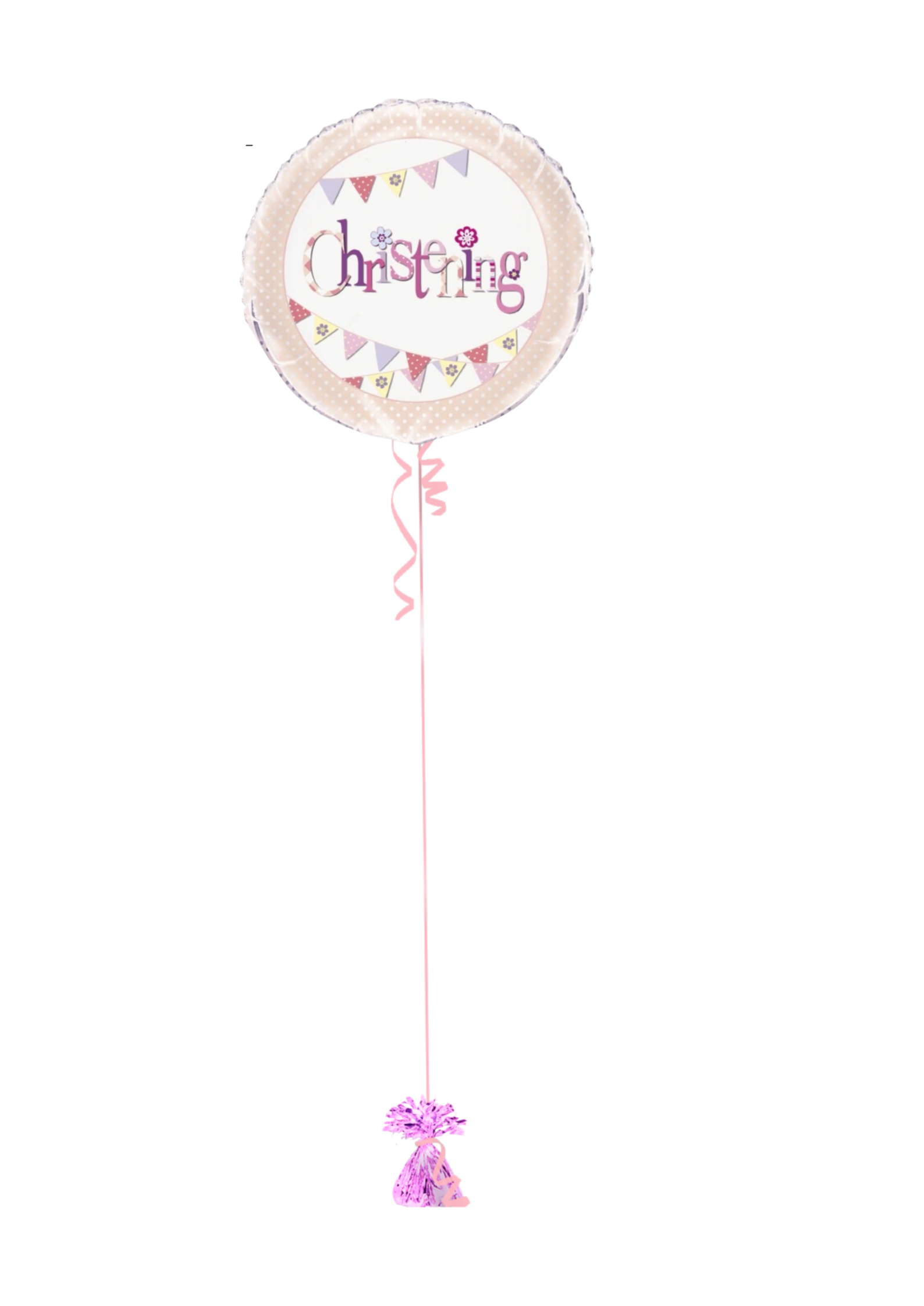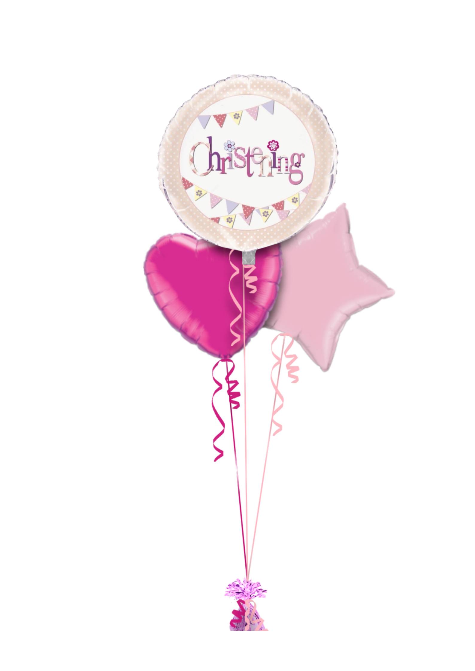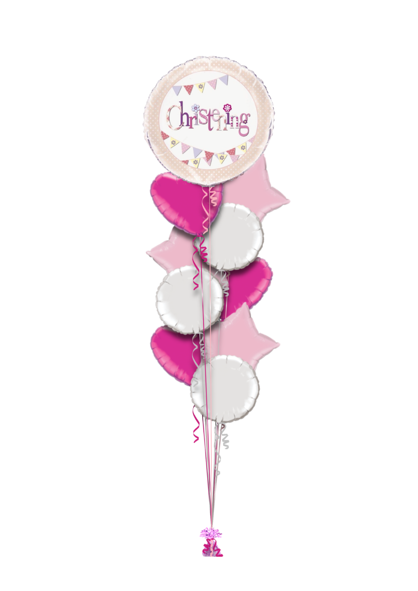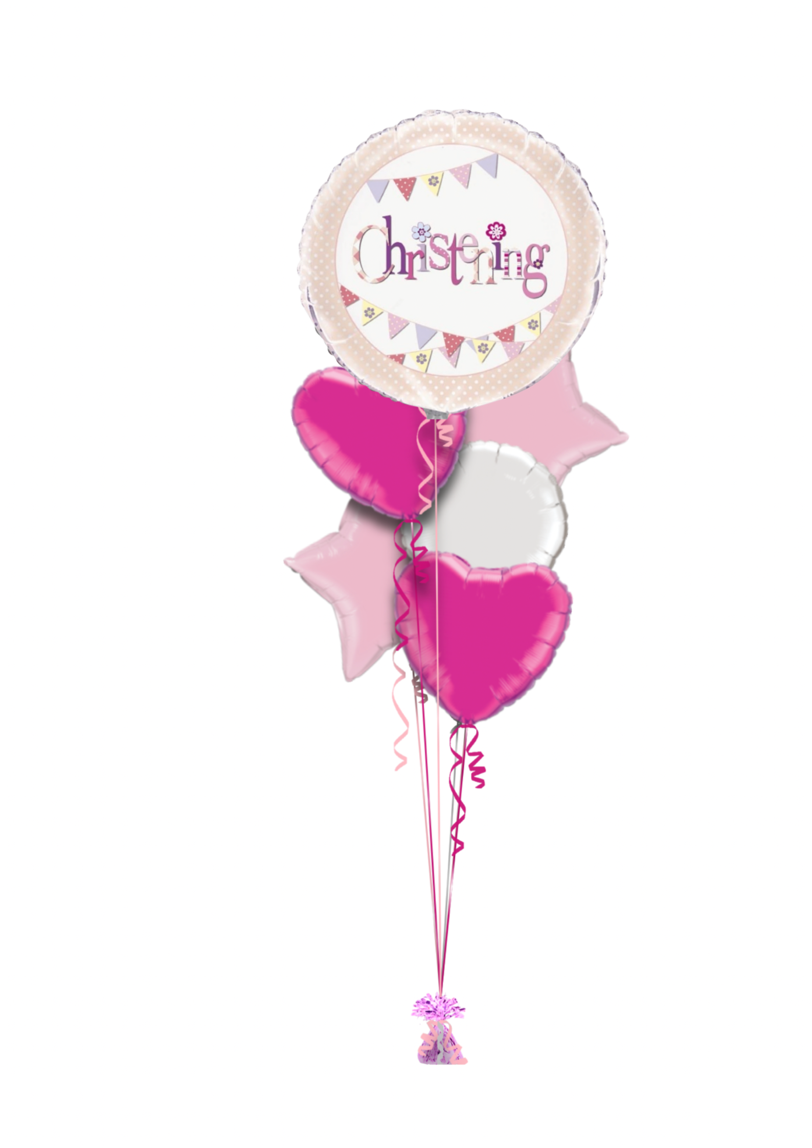 Celebrate her special day with this lovely pink Christening balloon setβfeaturing floral bunting, heart and star shapes, with curly ribbon and matching weight. π