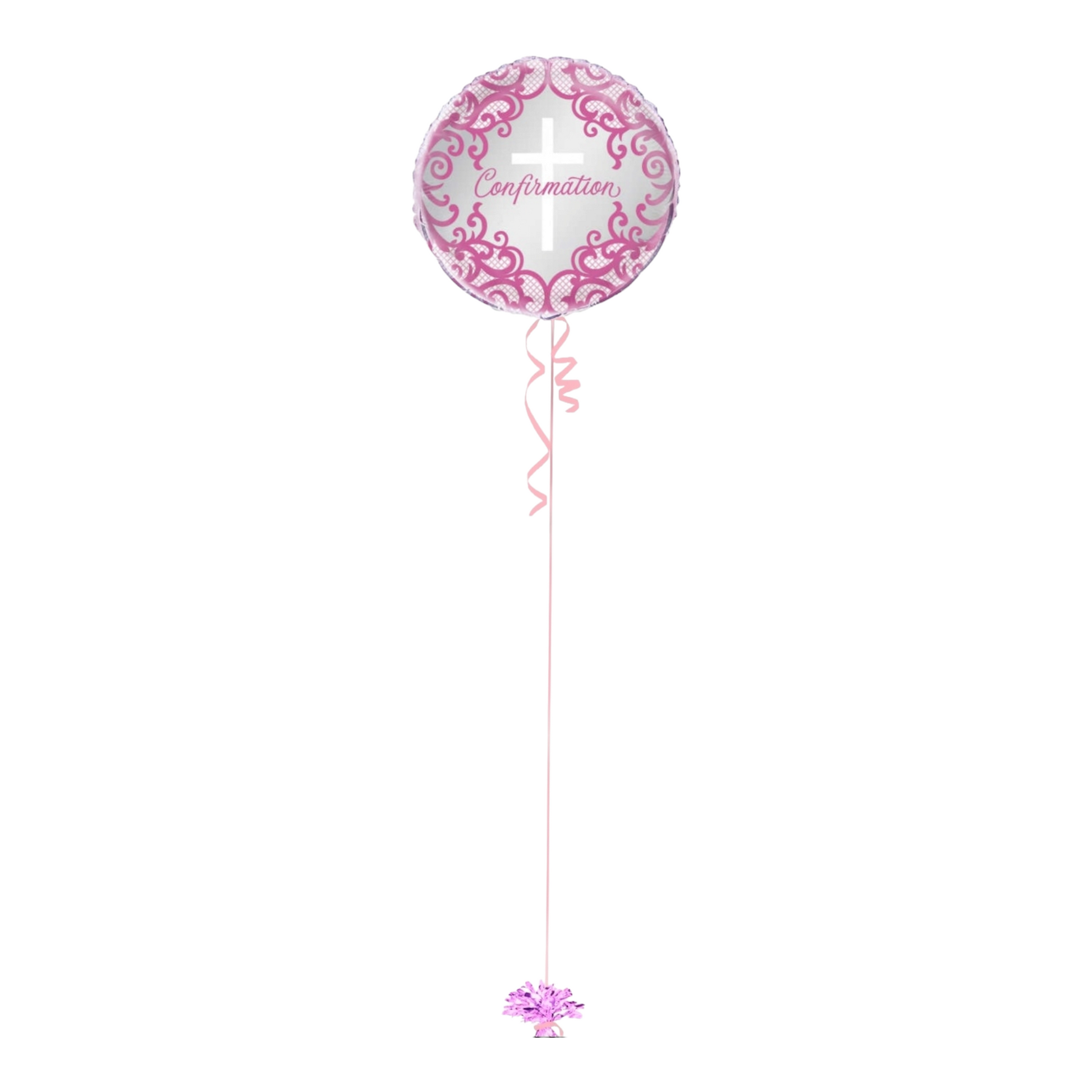 Celebrate a special Confirmation with this elegant foil balloon! Featuring a soft pink and white design with intricate swirls, a delicate cross, and "Confirmation" in stylish script, it’s a beautiful addition to the occasion. Complete with a curly pink ribbon and matching weight, this balloon is perfect for church gatherings, family celebrations, or party decorations. 🎀🙏